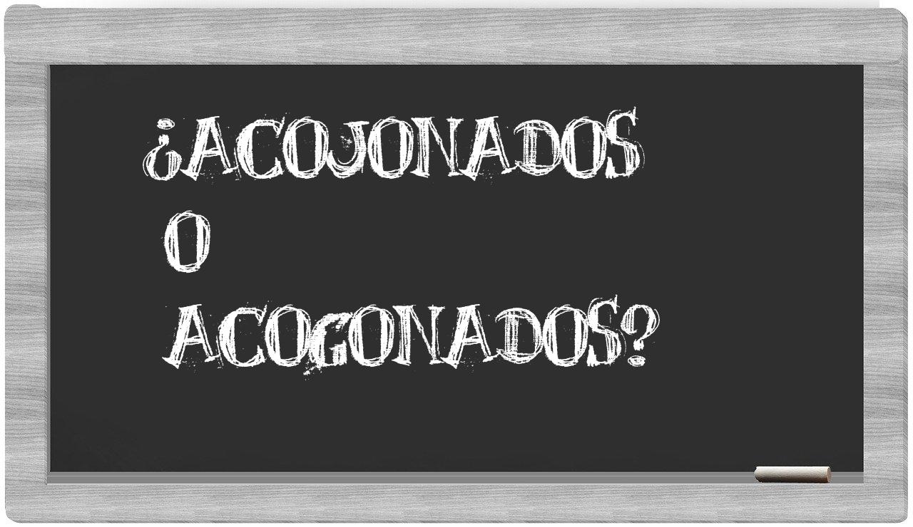 Cuando se trata de la relación entre acojonados y acogonados, no deberías siquiera titubear, porque únicamente acojonados es la opcion adecuada. acogonados carece de reconocimiento en el Diccionario de la Real Academia Española.