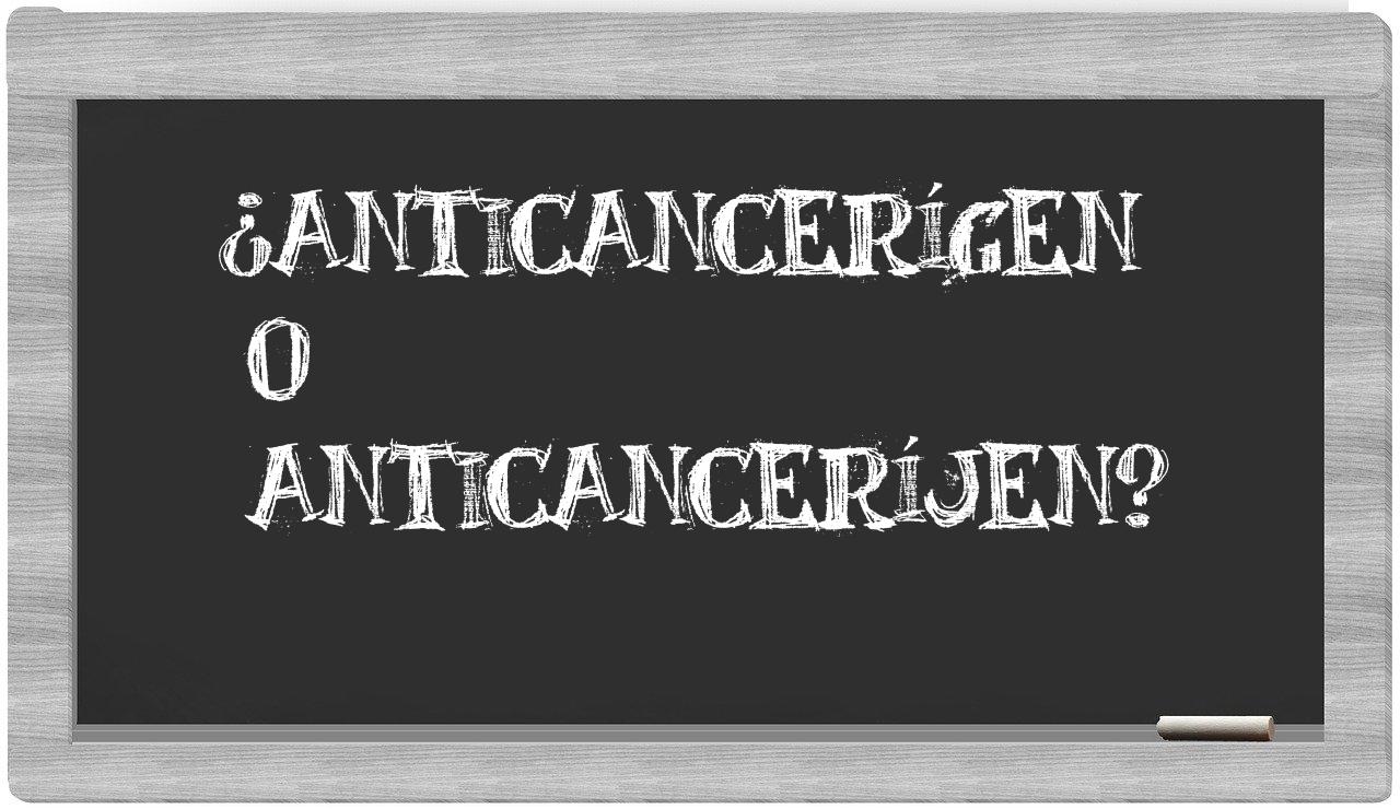 Cuando se trata de la comparación entre anticancerígen y anticanceríjen, no hay motivo alguno para titubear, puesto que únicamente anticancerígen se encuentra debidamente registrada en el Diccionario de la Real Academia Española, mientras que anticanceríjen carece de reconocimiento oficial.