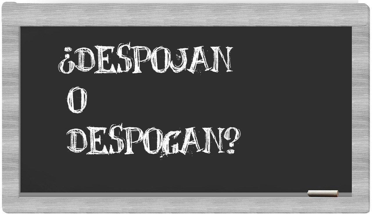 En la situación específica entre los términos despojan y despogan, nunca deberías vacilar, puesto que únicamente despojan se encuentra correctamente formulada. La palabra despogan no se halla registrada en el Diccionario de la Real Academia Española.
