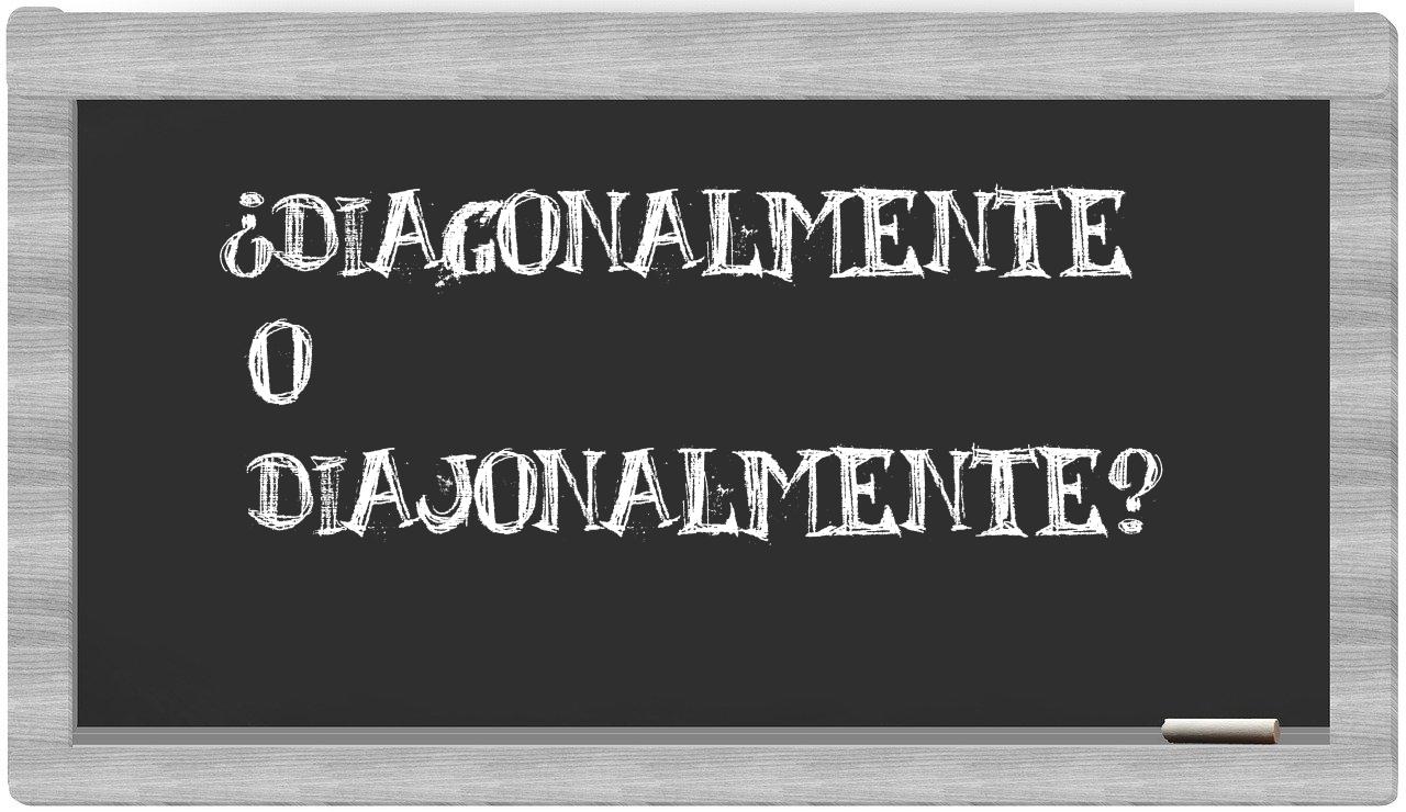 En la situación particular que involucra los términos diagonalmente y diajonalmente, no deberías tener ningún tipo de incertidumbre, puesto que únicamente diagonalmente se encuentra adecuadamente formulada. Por otro lado, diajonalmente carece de reconocimiento en el Diccionario de la Real Academia Española.