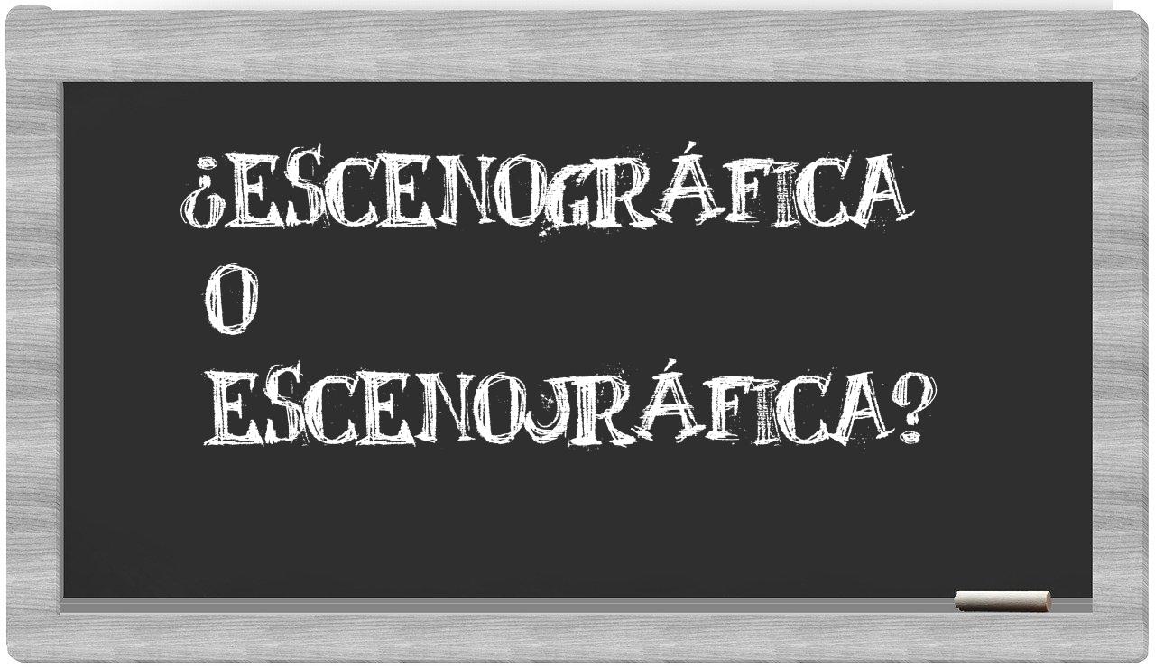 En la situación específica que involucra los términos escenográfica y escenojráfica, no deberías titubear, pues únicamente escenográfica se encuentra correctamente redactado. La palabra escenojráfica no existe en el Diccionario de la Real Academia Española.
