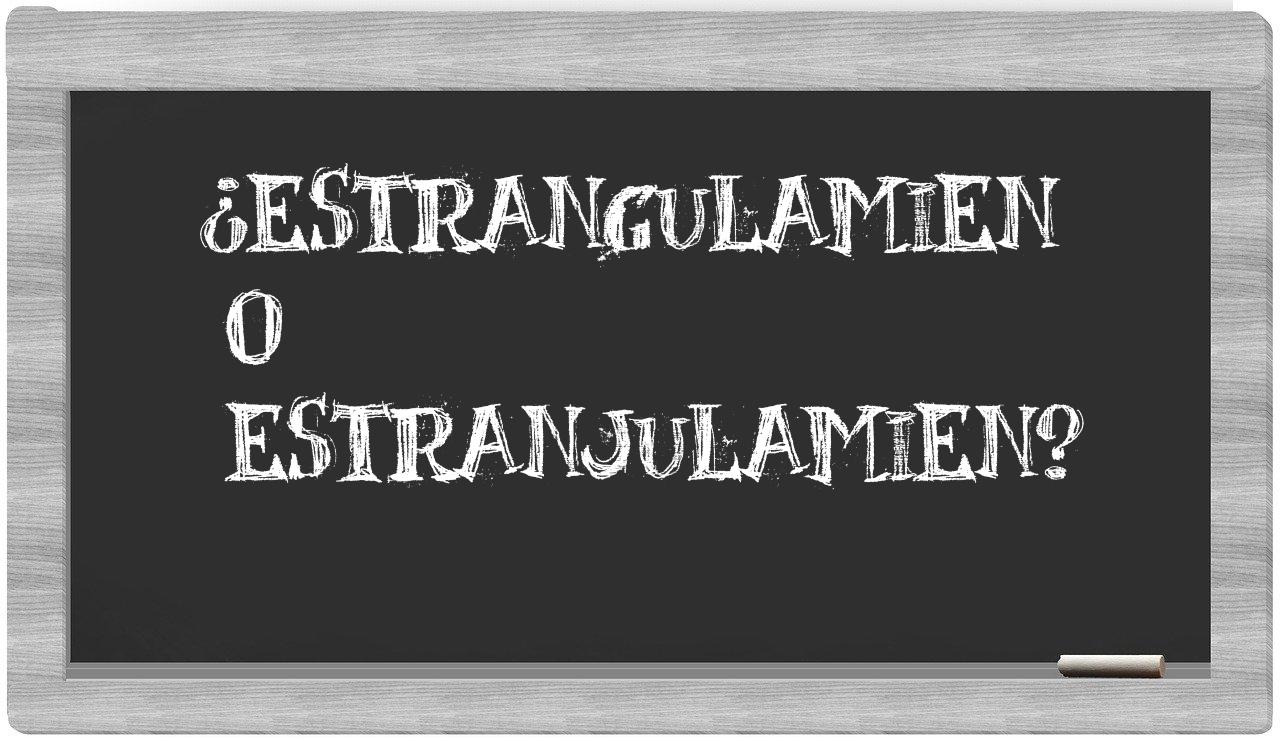 Cuando se trata de la distinción entre estrangulamien y estranjulamien, no deberías titubear ni un instante, puesto que únicamente estrangulamien se encuentra debidamente registrado. En cambio, estranjulamien carece de reconocimiento en el Diccionario de la Real Academia Española.