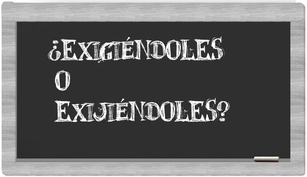 En la situación particular que involucra los términos exigiéndoles y exijiéndoles, nunca deberías titubear, porque únicamente exigiéndoles se encuentra debidamente redactado. Por otro lado, exijiéndoles no figura en el léxico aceptado por la Real Academia Española.