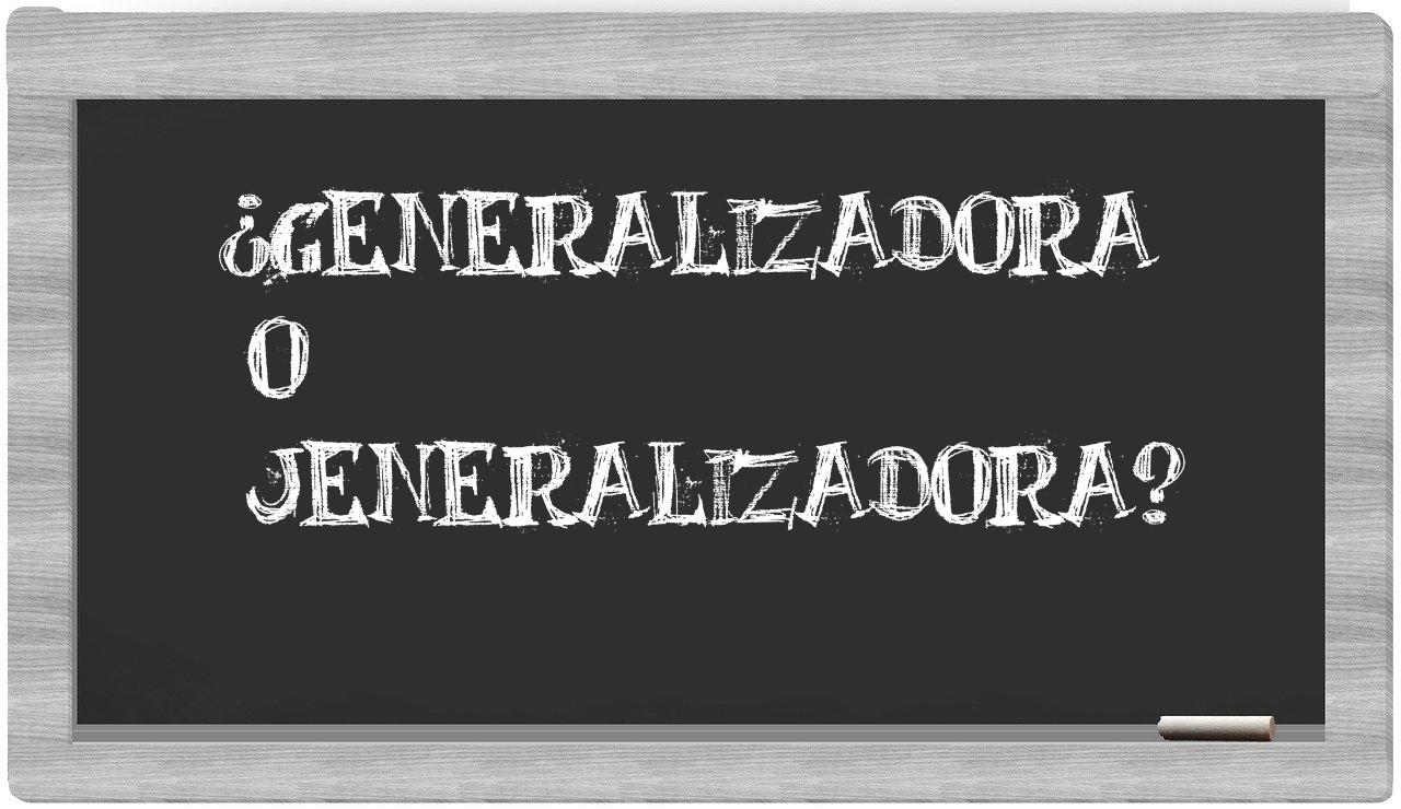 Cuando se trata de elegir entre generalizadora y jeneralizadora, nunca deberías vacilar, puesto que únicamente generalizadora es la opción que se encuentra bien redactada. Por otro lado, jeneralizadora no se encuentra registrada en el Diccionario de la Real Academia Española.