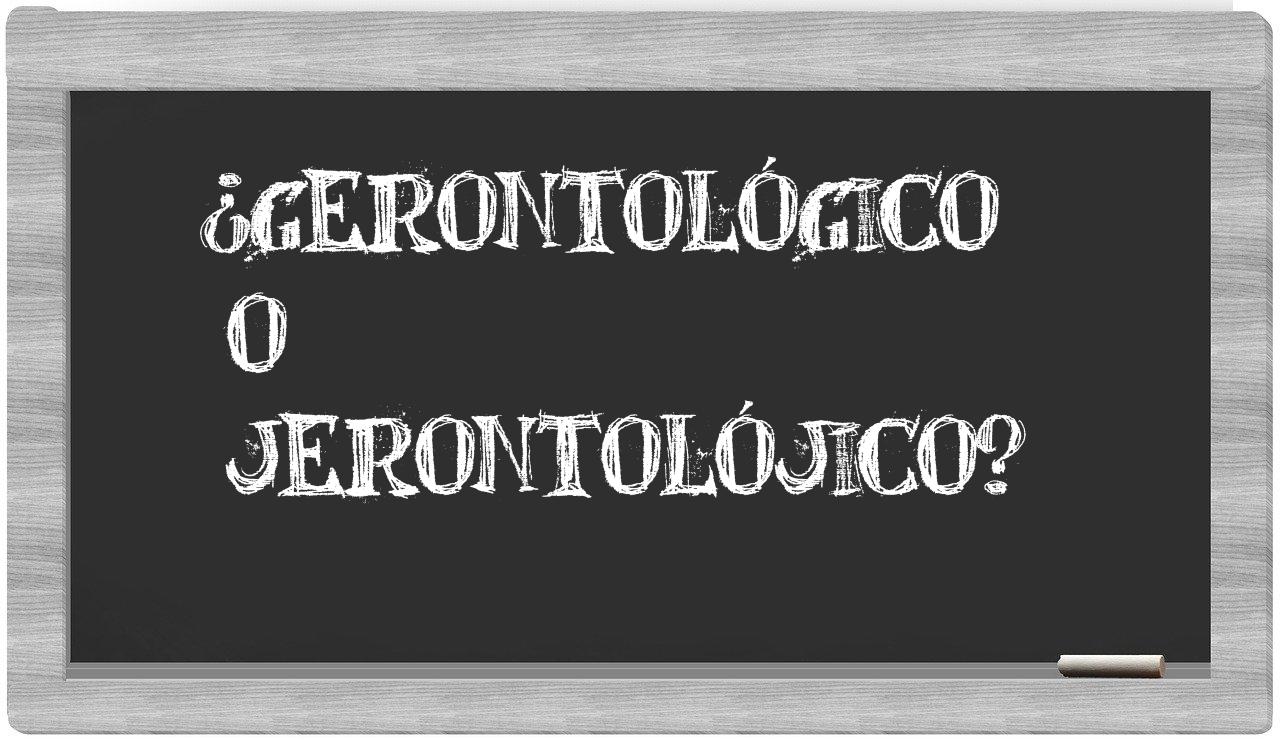 En la situación específica que involucra los términos gerontológico y jerontolójico, no deberías vacilar en tu elección, pues únicamente gerontológico se encuentra debidamente registrada, mientras que jerontolójico no figura en el repertorio del Diccionario de la Real Academia Española.