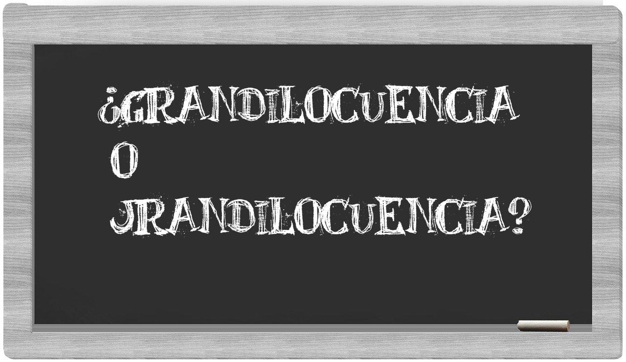 En la situación específica entre los términos grandilocuencia y jrandilocuencia, nunca deberías vacilar, puesto que únicamente grandilocuencia se encuentra correctamente formulada. La palabra jrandilocuencia no se halla registrada en el Diccionario de la Real Academia Española.