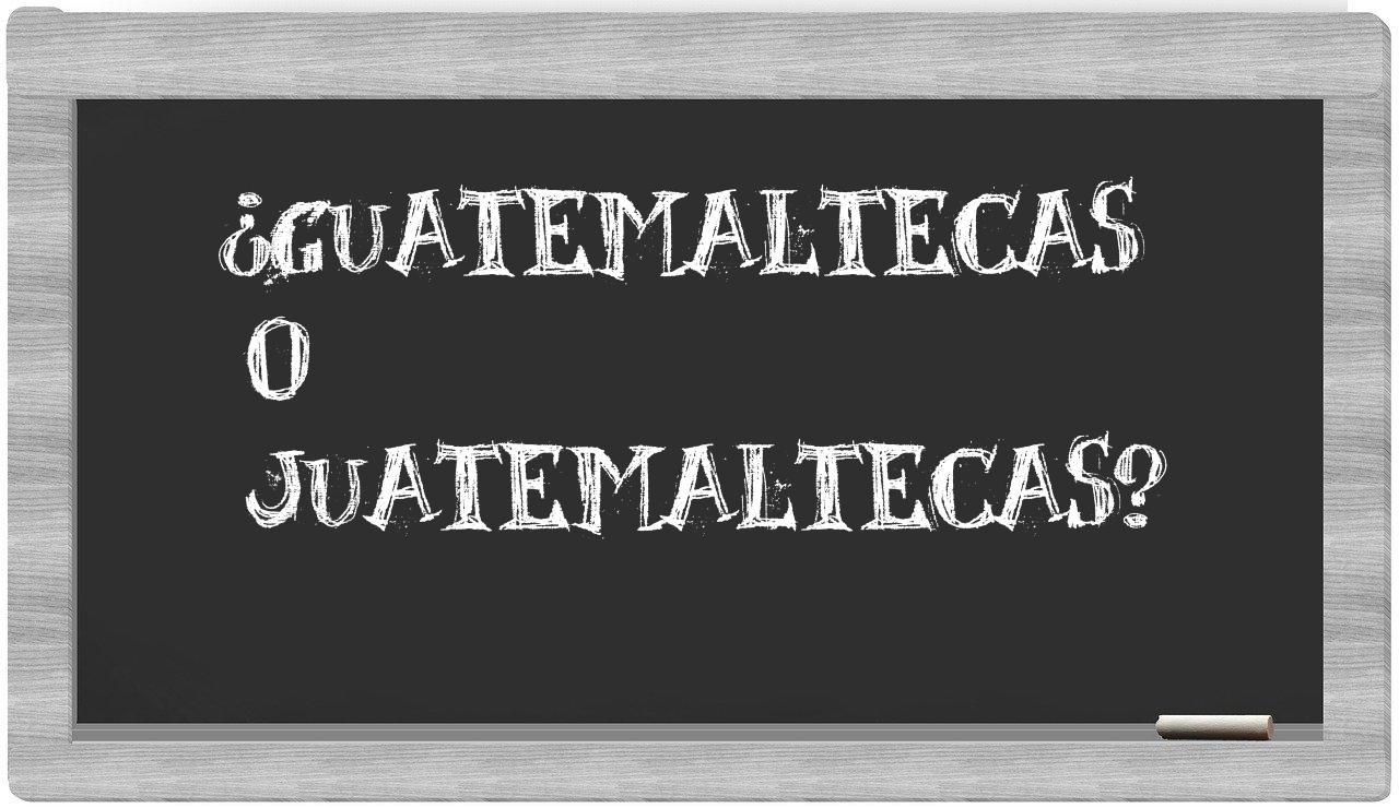 Cuando te encuentres ante la elección entre guatemaltecas y juatemaltecas, no vaciles ni un instante, puesto que solo guatemaltecas es la opción que cuenta con la validación adecuada, mientras que juatemaltecas no se encuentra registrada en el prestigioso Diccionario de la Real Academia de la Lengua.