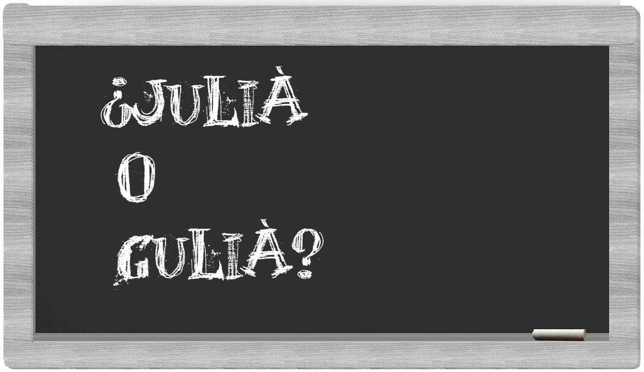 En lo que respecta a la relación entre julià y gulià, no deberías tener ninguna incertidumbre, puesto que únicamente julià se presenta como la opción adecuada. Por otro lado, gulià no se encuentra registrada en el Diccionario de la Real Academia Española.