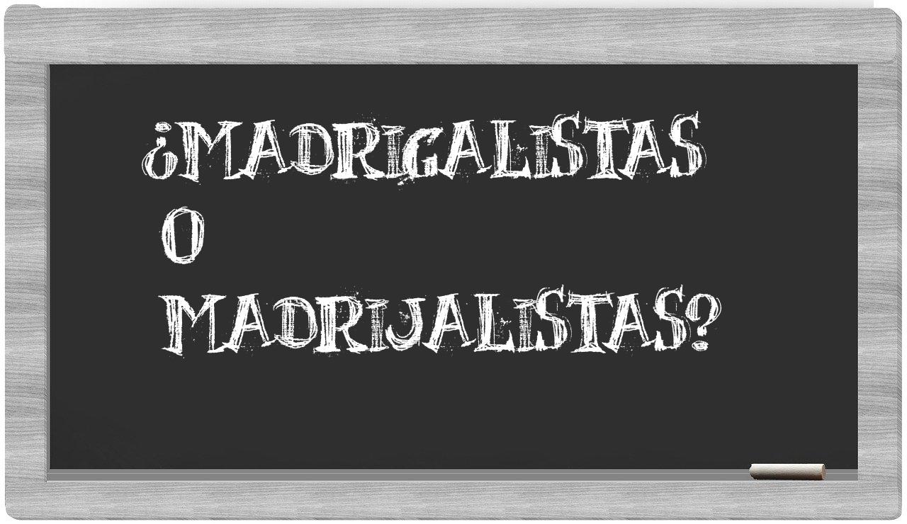 Cuando te encuentres ante la disyuntiva entre madrigalistas y madrijalistas, no vaciles, porque solo madrigalistas se presenta como la opción adecuada, mientras que madrijalistas es un término que no se encuentra registrado en el Diccionario de la Real Academia Española.