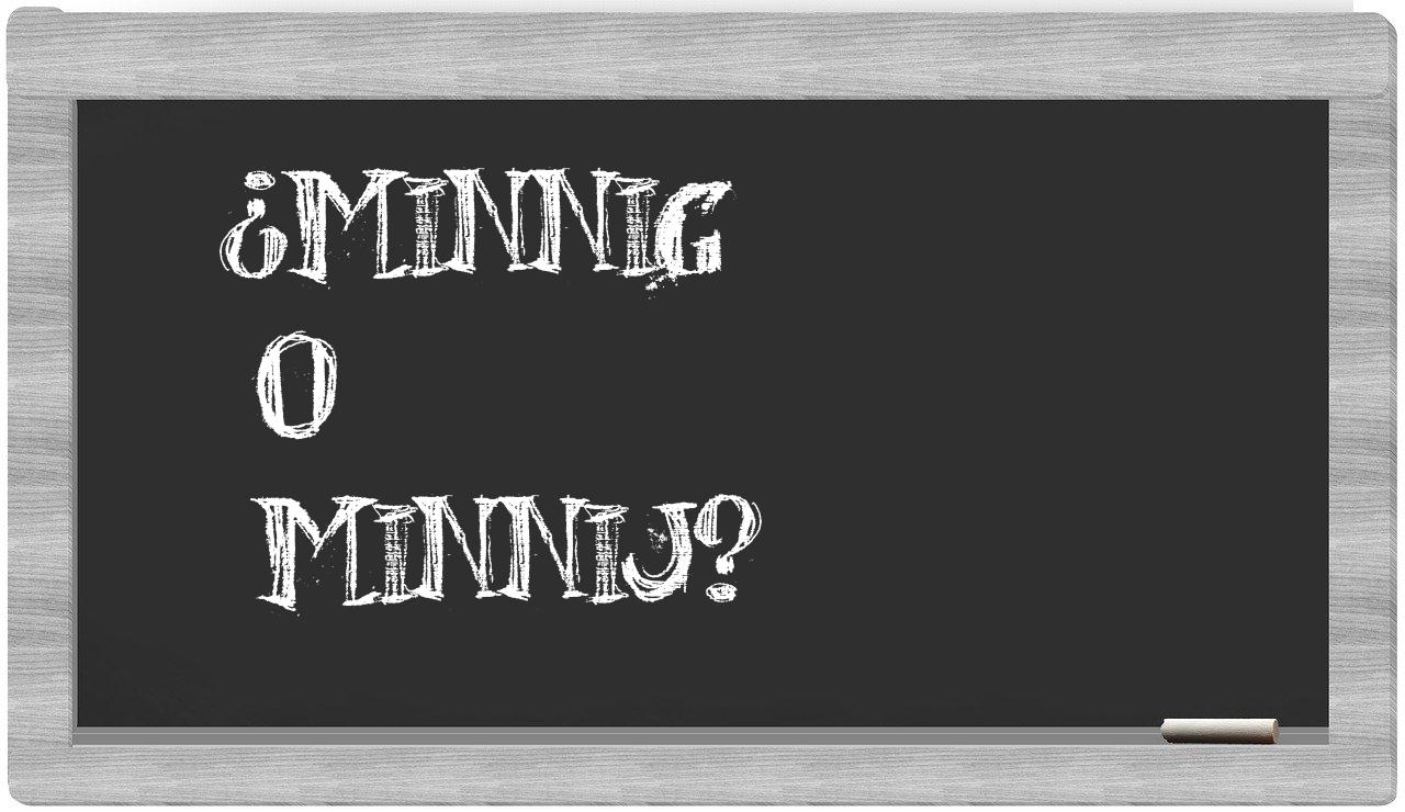 En la situación específica que involucra a minnig y minnij, no deberías experimentar la más mínima indecisión, puesto que únicamente minnig está debidamente redactada. Por otro lado, minnij carece de reconocimiento en el Diccionario de la Real Academia Española.