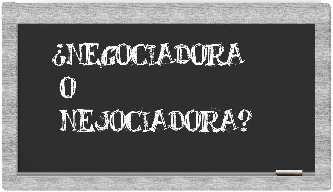 Cuando se trata de discernir entre negociadora y nejociadora, la elección debería ser clara como el agua, puesto que únicamente negociadora se encuentra debidamente registrada en el Diccionario de la Real Academia Española, mientras que nejociadora no figura en sus páginas.