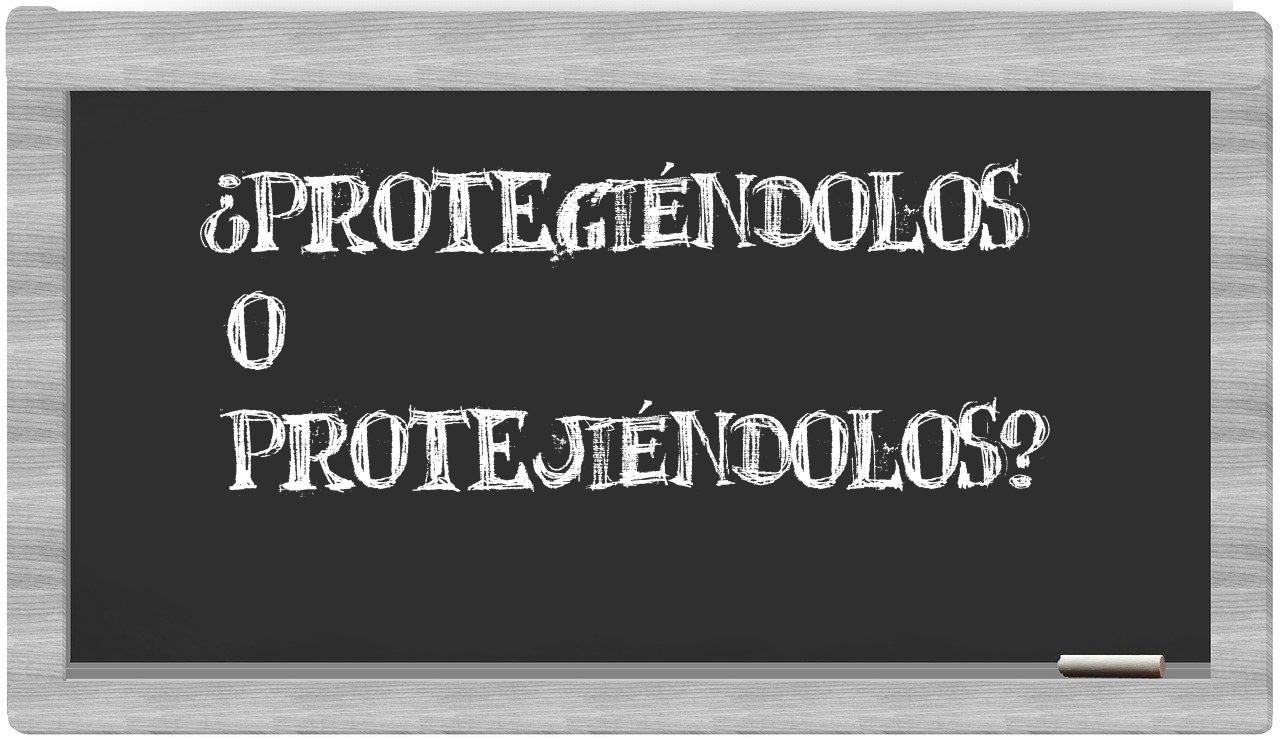 En la situación particular que involucra a protegiéndolos y protejiéndolos, nunca debes titubear, puesto que únicamente protegiéndolos es la forma adecuada; por otro lado, protejiéndolos no se encuentra registrada en el Diccionario de la Real Academia Española.