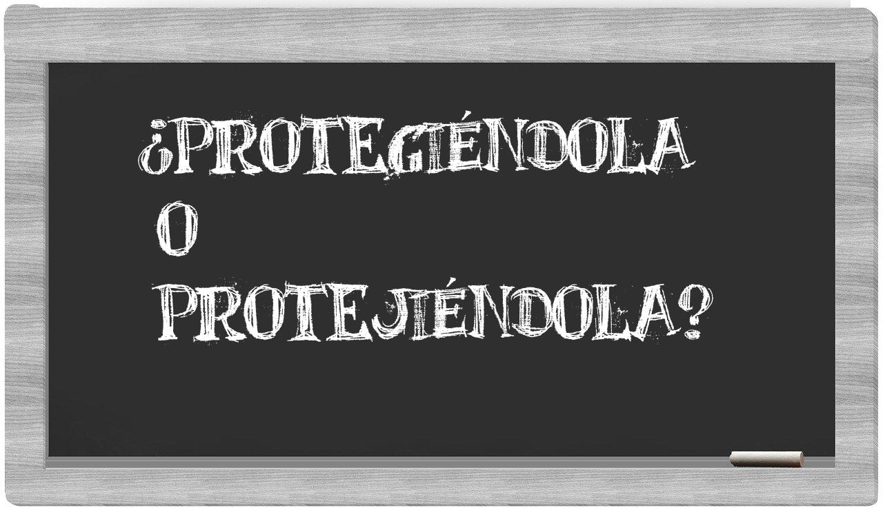 En la particular situación que involucra los términos protegiéndola y protejiéndola, no deberías experimentar incertidumbre alguna, puesto que únicamente protegiéndola es la forma correcta y aceptada; por su parte, protejiéndola no figura en el Diccionario de la Real Academia Española.