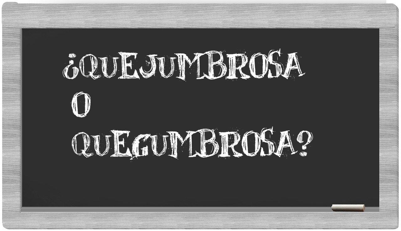 Cuando te enfrentes a la disyuntiva entre quejumbrosa y quegumbrosa, no vaciles en tu elección, porque únicamente quejumbrosa es la opción que se encuentra debidamente registrada en el Diccionario de la Real Academia Española, mientras que quegumbrosa carece de reconocimiento oficial.