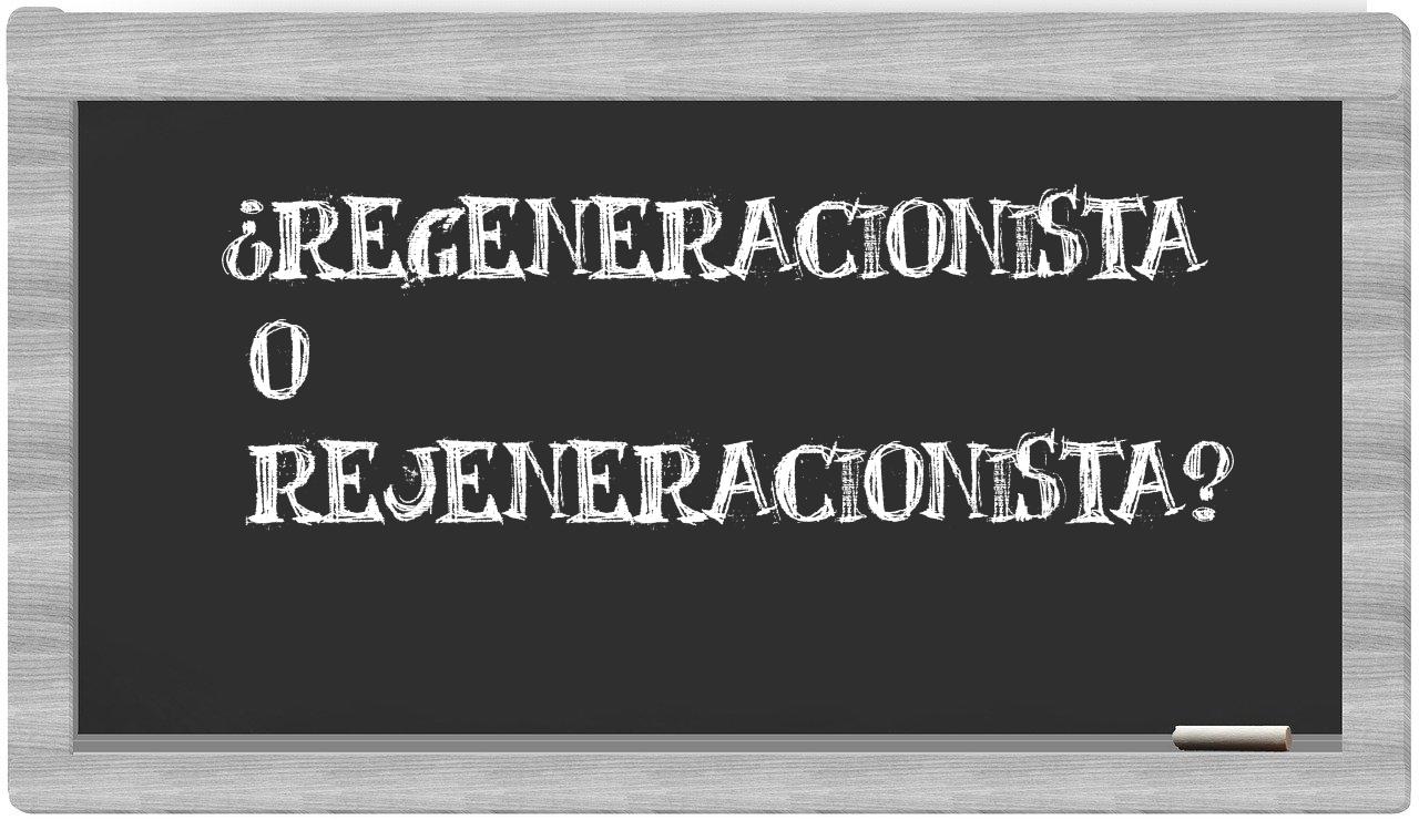 Cuando se trata de elegir entre las palabras regeneracionista y rejeneracionista, no deberías titubear, puesto que únicamente regeneracionista se encuentra correctamente plasmada, mientras que rejeneracionista no figura en el Diccionario de la Real Academia Española.