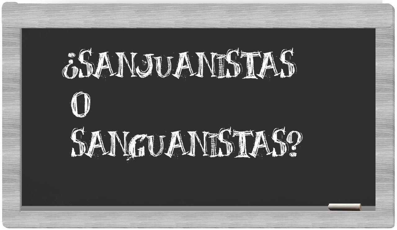 Cuando se trata de la distinción entre sanjuanistas y sanguanistas, no deberías titubear ni un instante, puesto que únicamente sanjuanistas se encuentra debidamente registrado. En cambio, sanguanistas carece de reconocimiento en el Diccionario de la Real Academia Española.